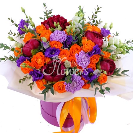 Композиция в коробке из розовых пионов,эустомы и роз "Лаконичная нежность"